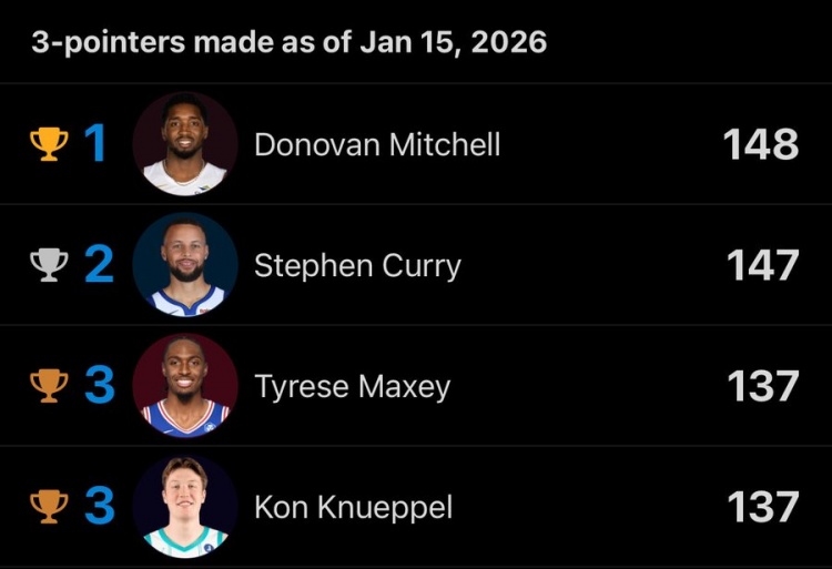 开云体育下载-三分命中榜:米切尔148记 库里147记 马克西&克尼佩尔137记