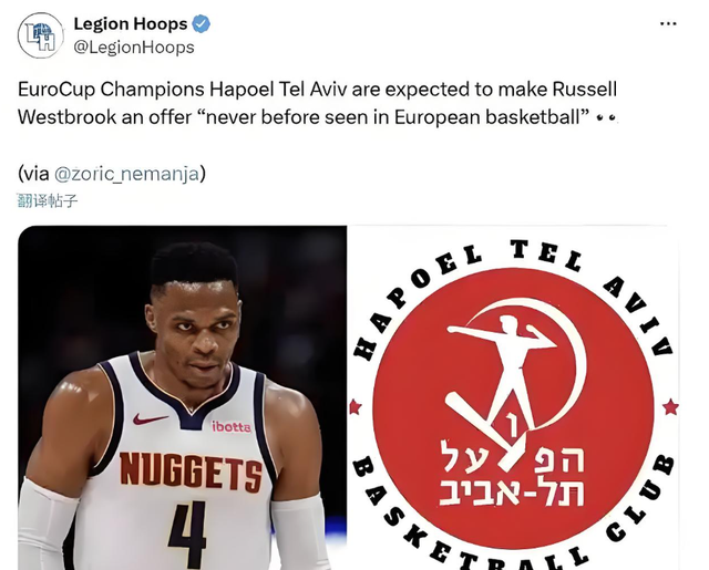 “特拉维夫夏普尔正在接触NBA球星威斯布鲁克,双方一度接近签约状态,更有消息称球队开出的签约合同价值超过了5000万。”